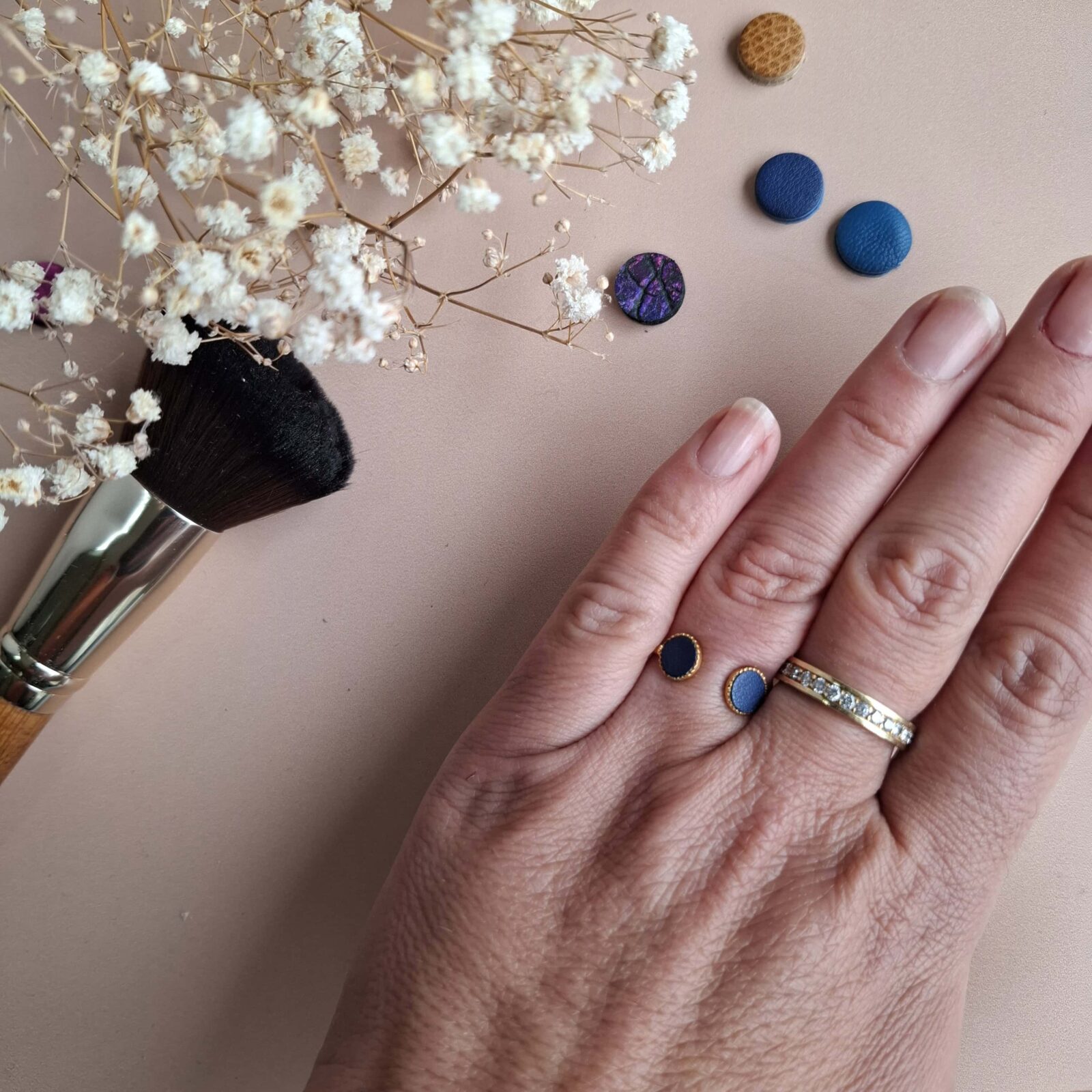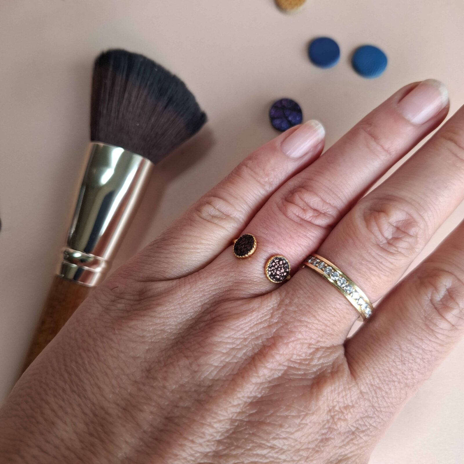 Bague double, plaqué or, pastilles de cuir upcyclé, tour de doigt ajustable entre 48 et 52. Disponible en bleu, vert, rouge et marron brillant — autre couleur sur demande. Sans nickel, sans plomb, sans cadmium. Origine Europe.