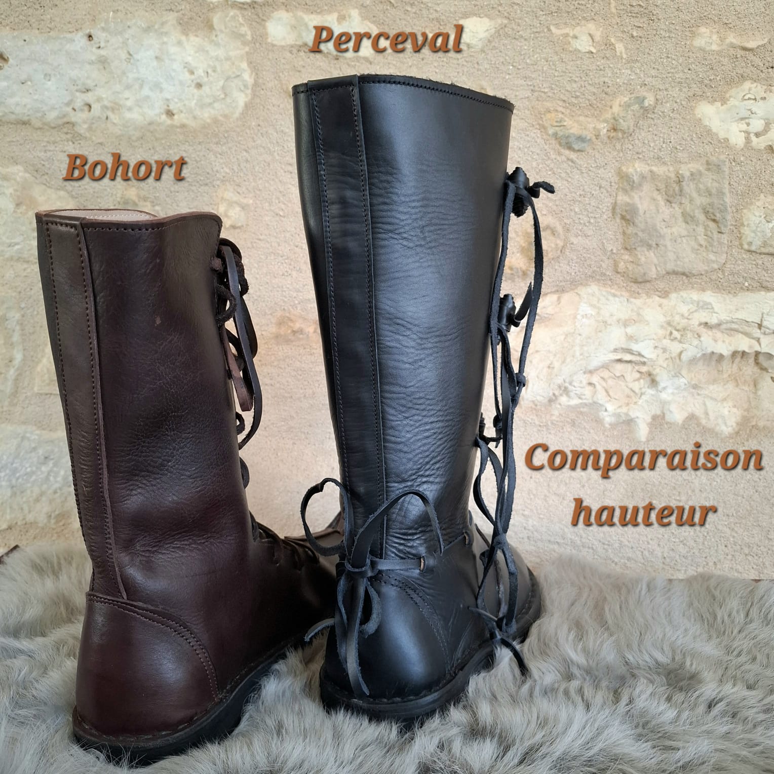 Si vous rentrez votre pantalon dans la botte, si vous faites du béhourd, si vous soignez votre costume des éperons jusqu'au chaperon, Perceval est faite pour vous : 38 cm de tige, fermoirs latéraux, silhouette plus imposante. Si vous bougez beaucoup, cherchez un maintien précis et réglable et préférez une silhouette sobre qui va avec tout, c'est Bohort. Les deux se complètent naturellement dans un équipement de reconstitution.