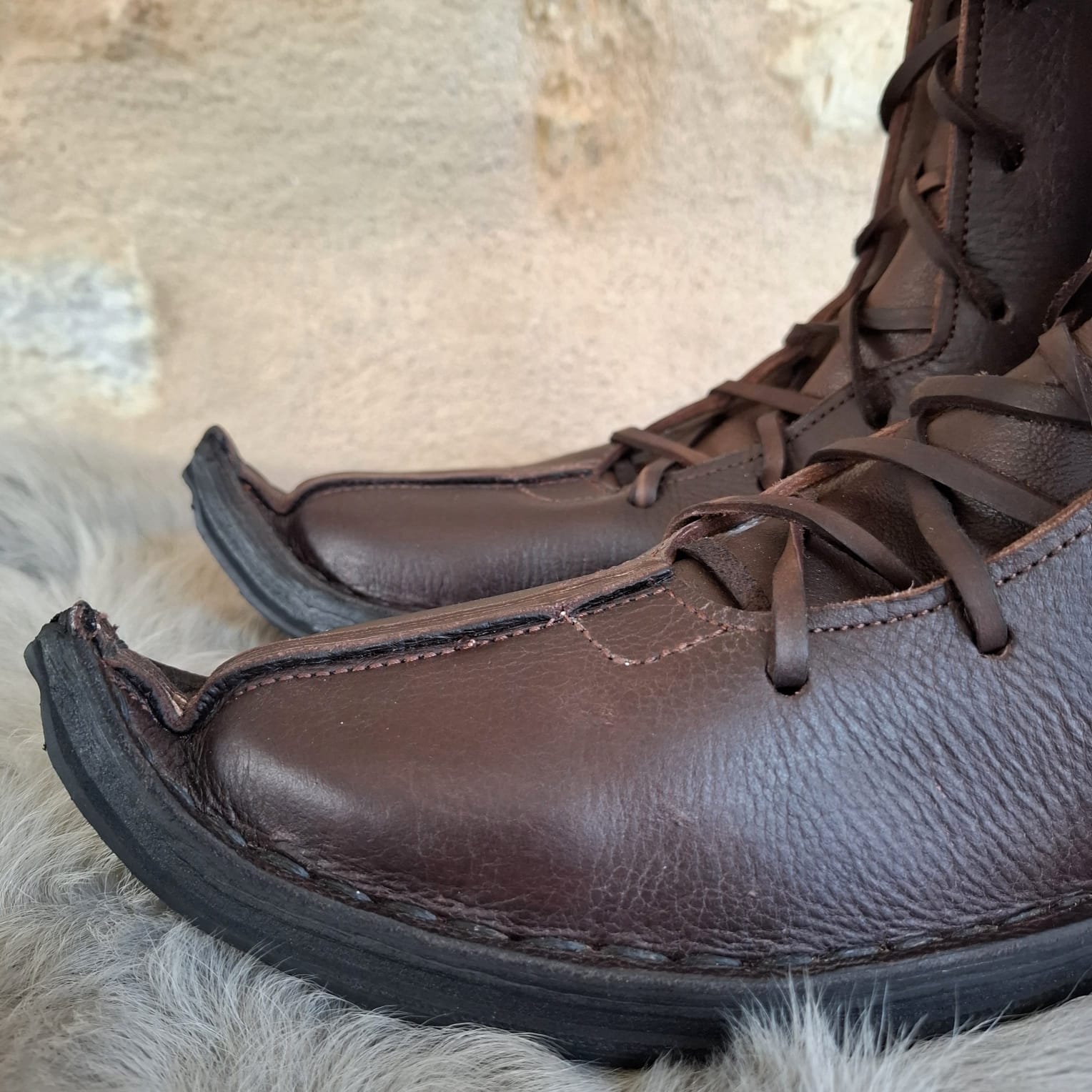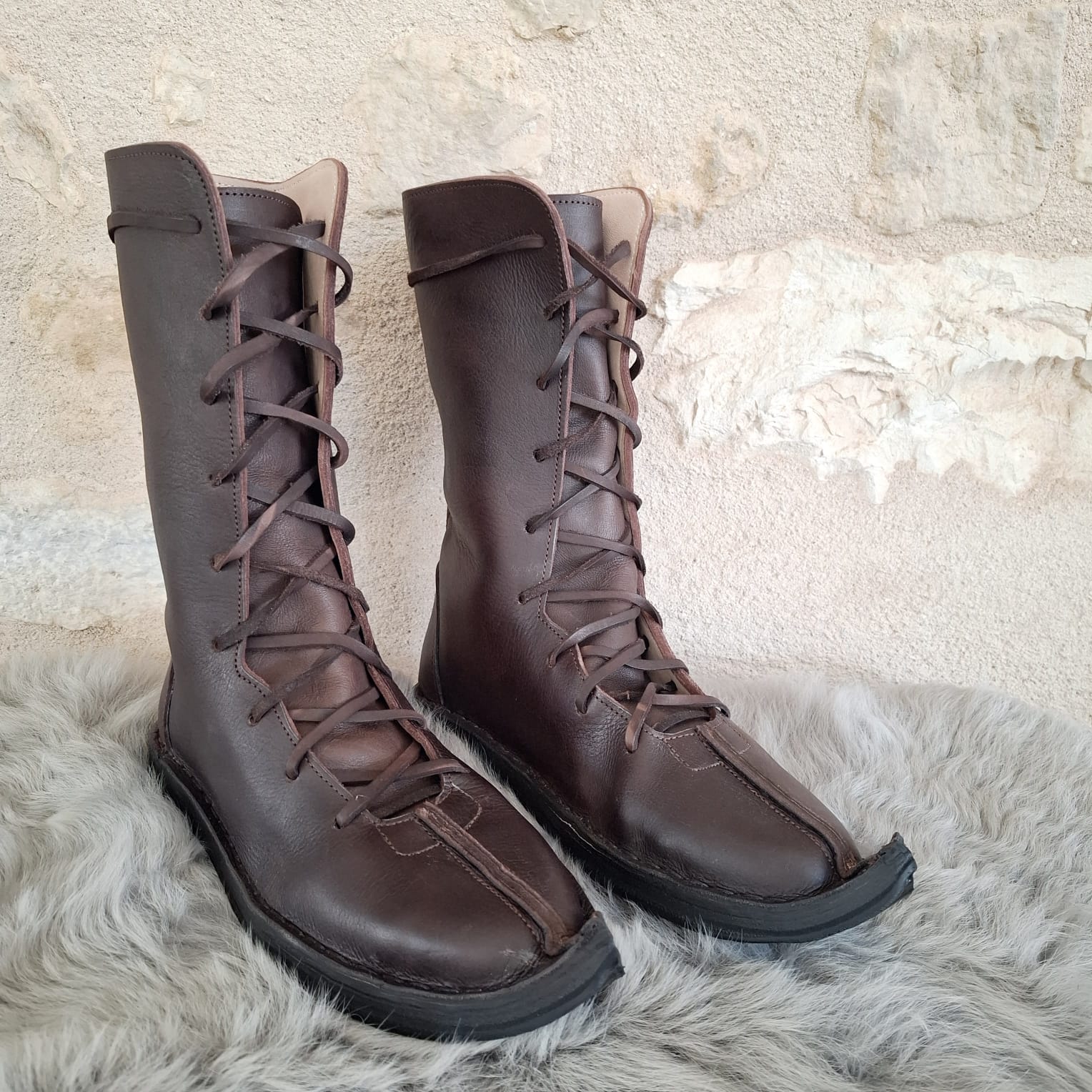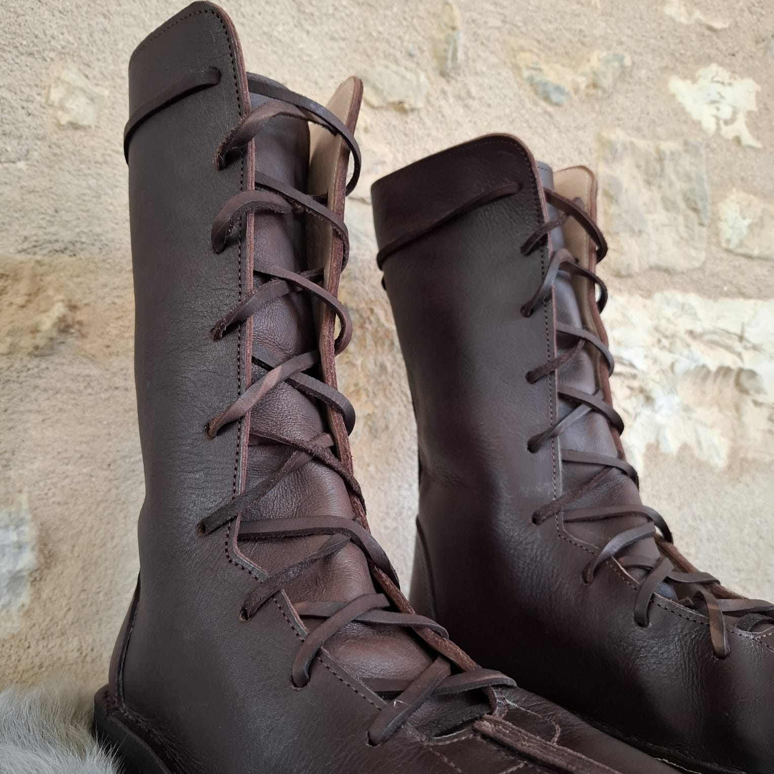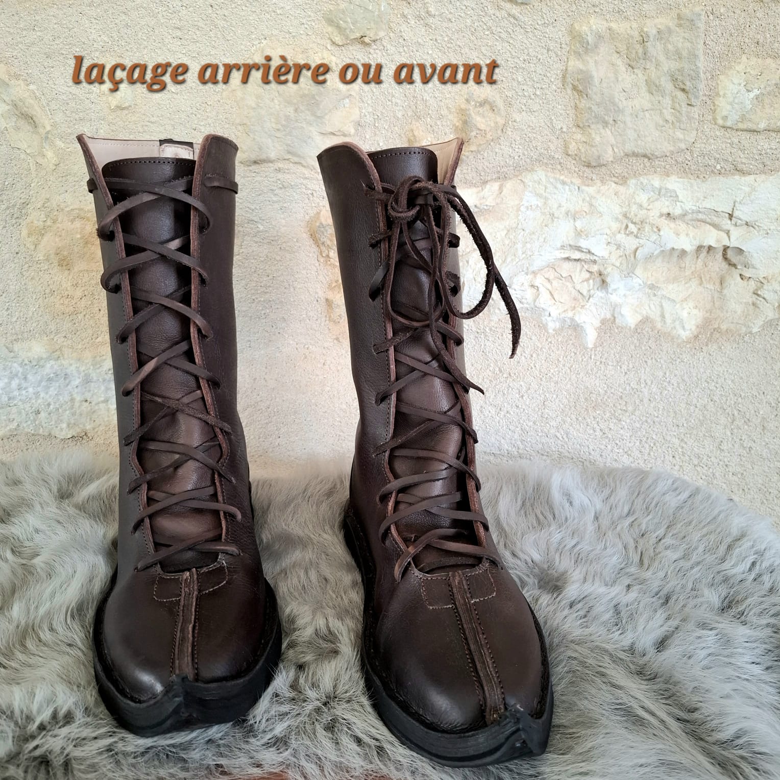 Bottes médiévales en cuir faites main, laçage frontal intégral du coup de pied au tibia. Tige mi-mollet 32 cm, cuir de vachette robuste, doublure mouton. Pour ceux qui bougent beaucoup et veulent un maintien réglé exactement là où il faut pendant les GN, reconstitutions et fêtes médiévales.