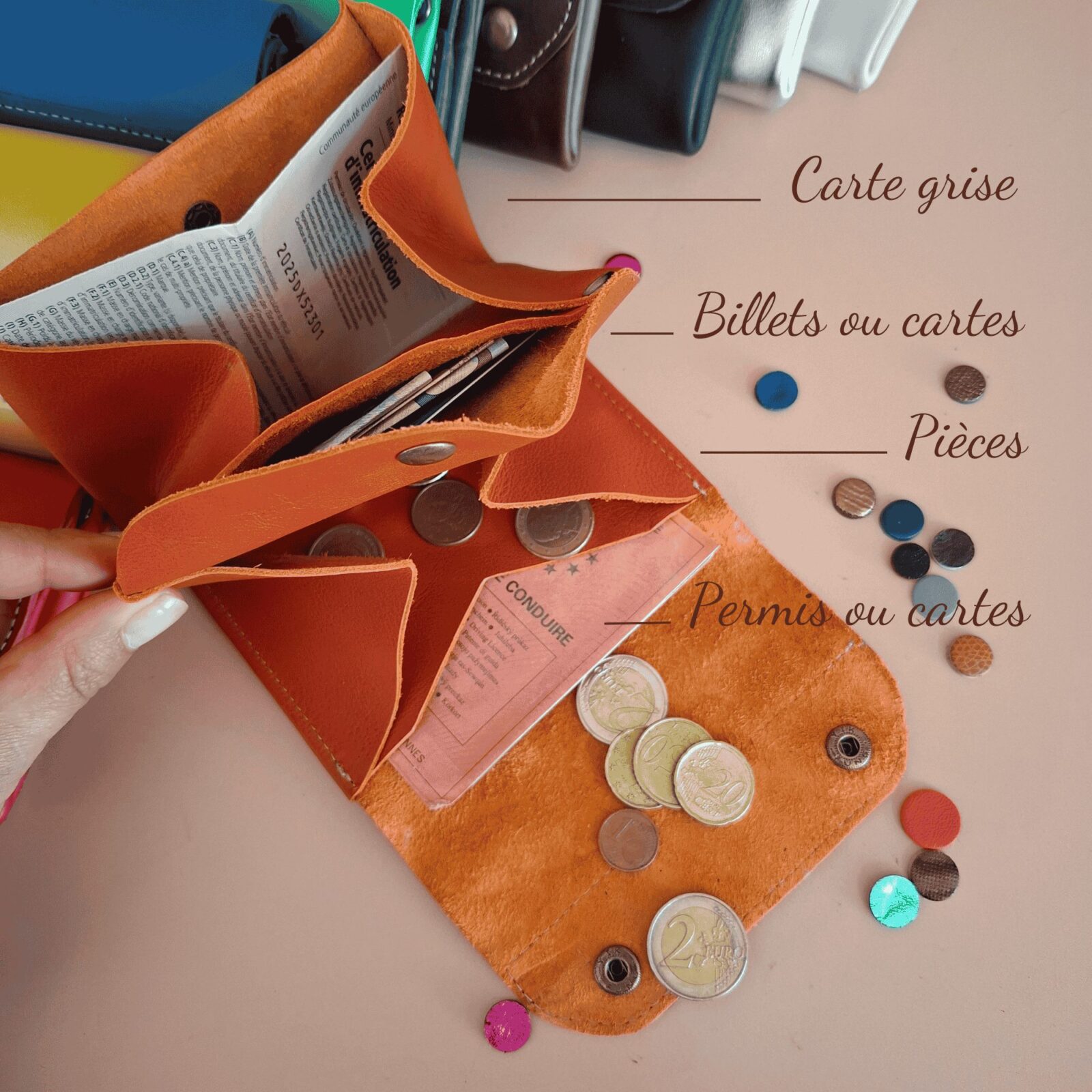 Le Grand Malin, c’est le portefeuille cuir artisanal qui range tout — billets, monnaie, cartes, permis et carte grise — sans sacrifier le style. Disponible en 10 couleurs franches.