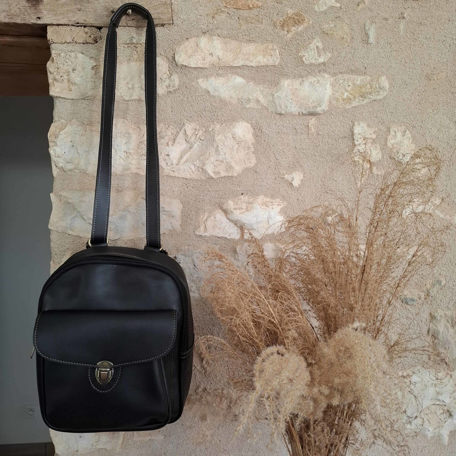 Petit sac à dos en cuir noir : polyvalent, pratique et stylé, il passe du sac à dos à la bandoulière en un clin d’œil.