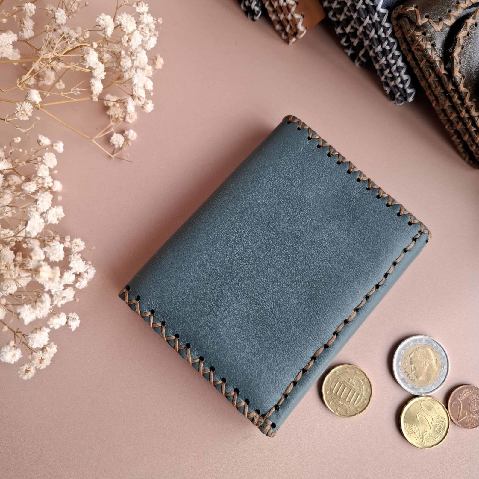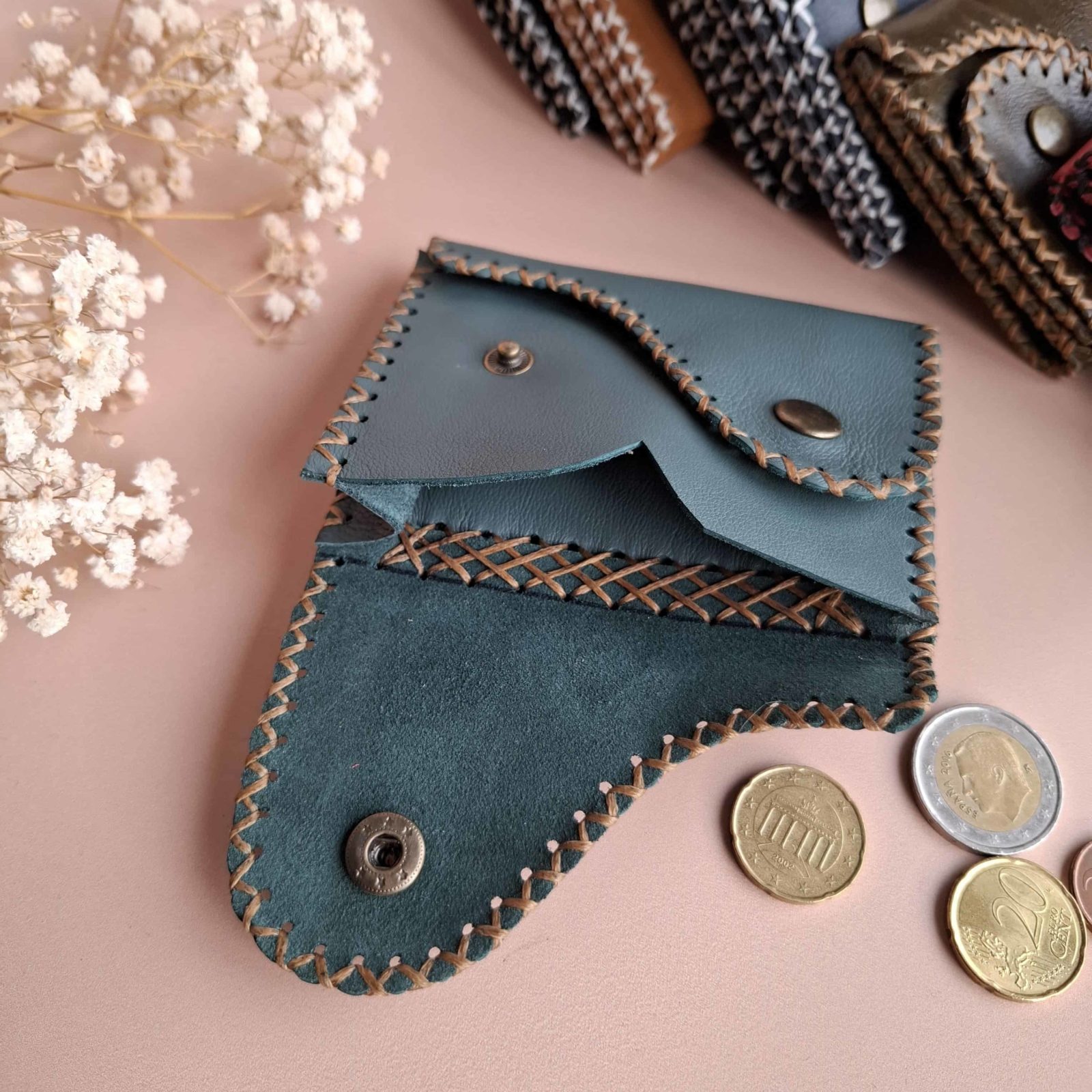 Craquez pour ce porte-cartes en cuir artisanal bleu pétrole, fait main en France. Élégant, compact et durable, il garde vos cartes, billets et monnaie avec style et vous accompagne partout.