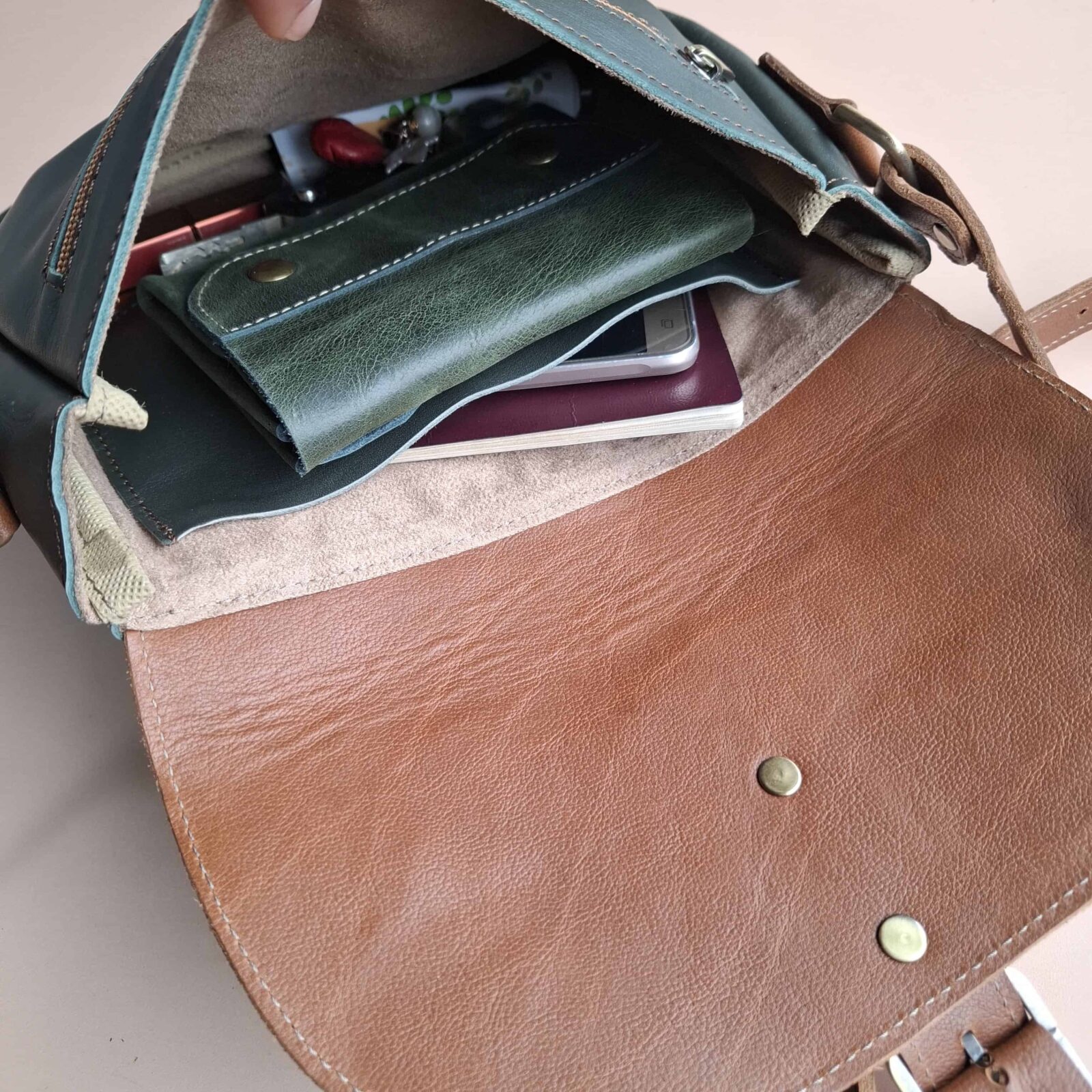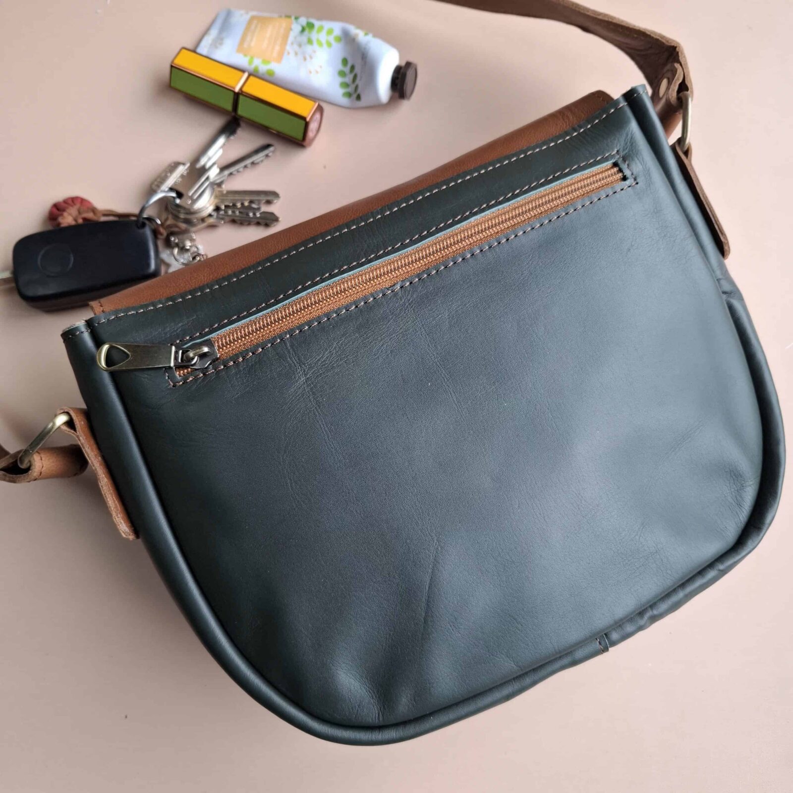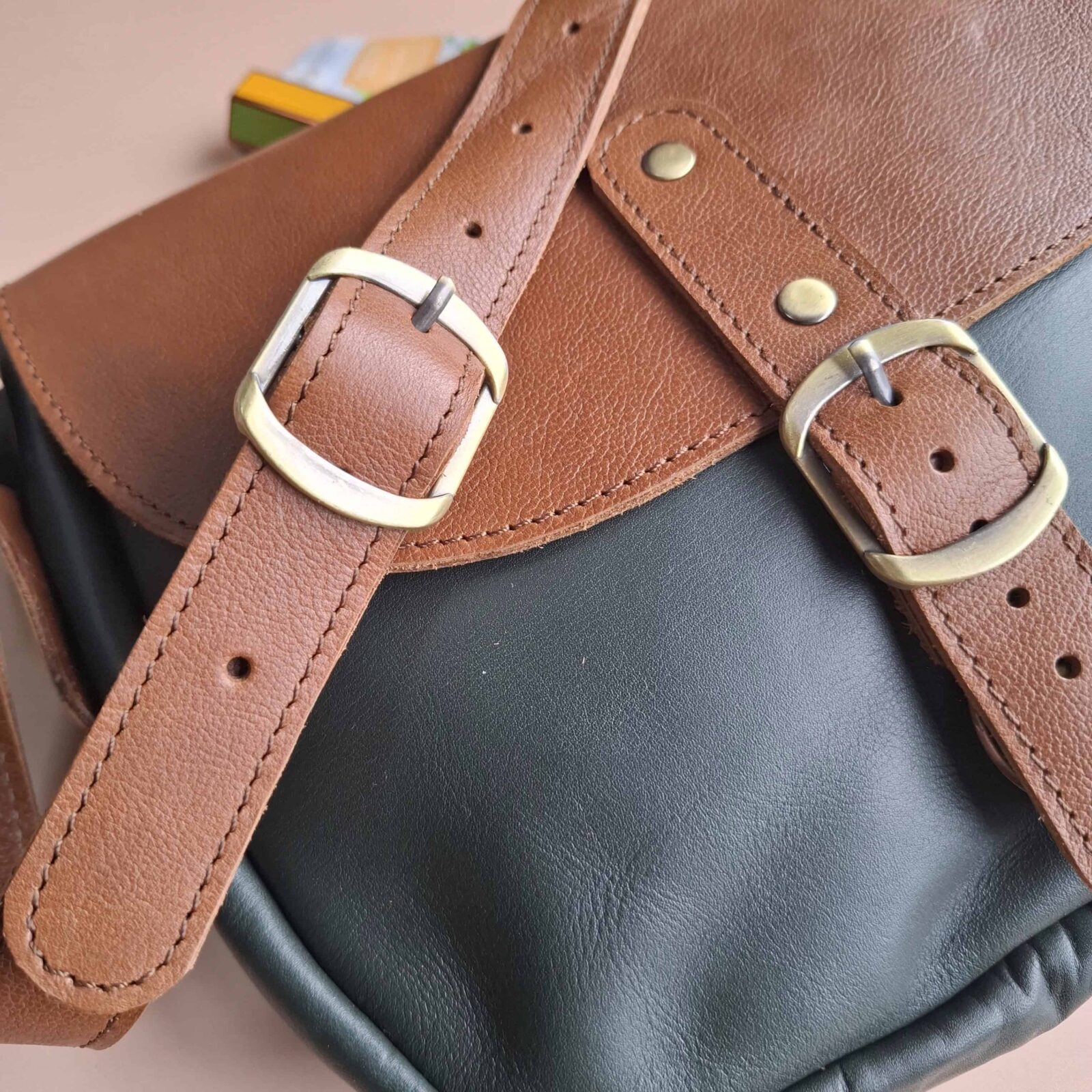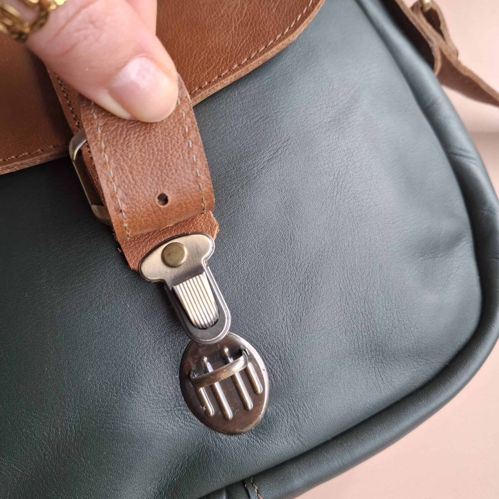 Sac bandoulière cuir vert foncé et marron – pièce unique