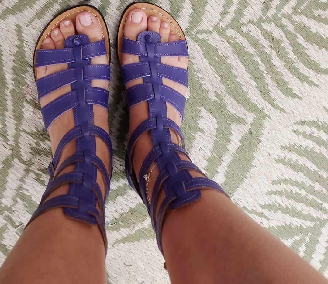 Des spartiates en cuir violet faites main : confort immédiat, maintien cheville, fermeture éclair. Et un cuir qu'on ne retrouvera pas.